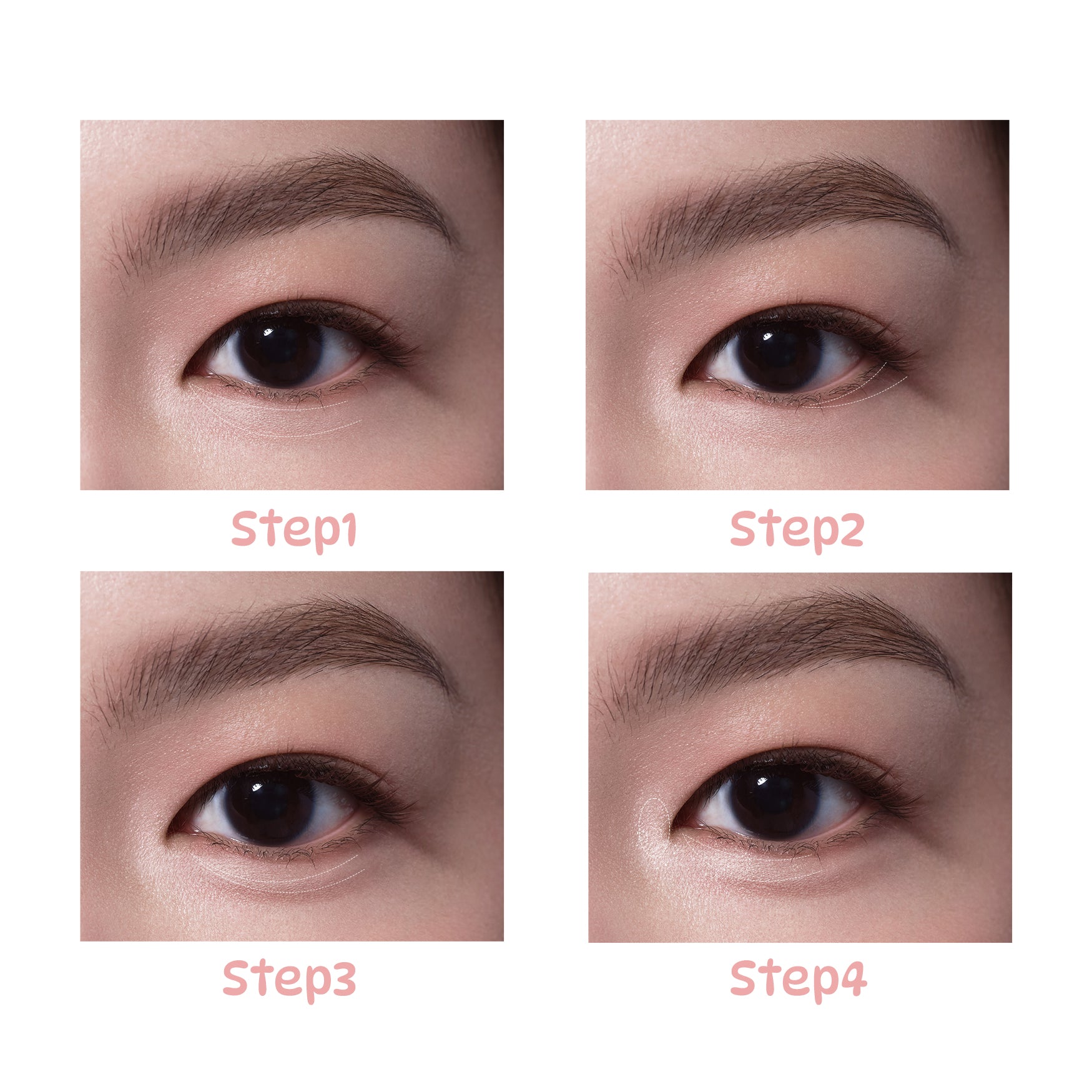 - Brighten – Use matte shade ① to create a clean, lifted base on your under-eye area