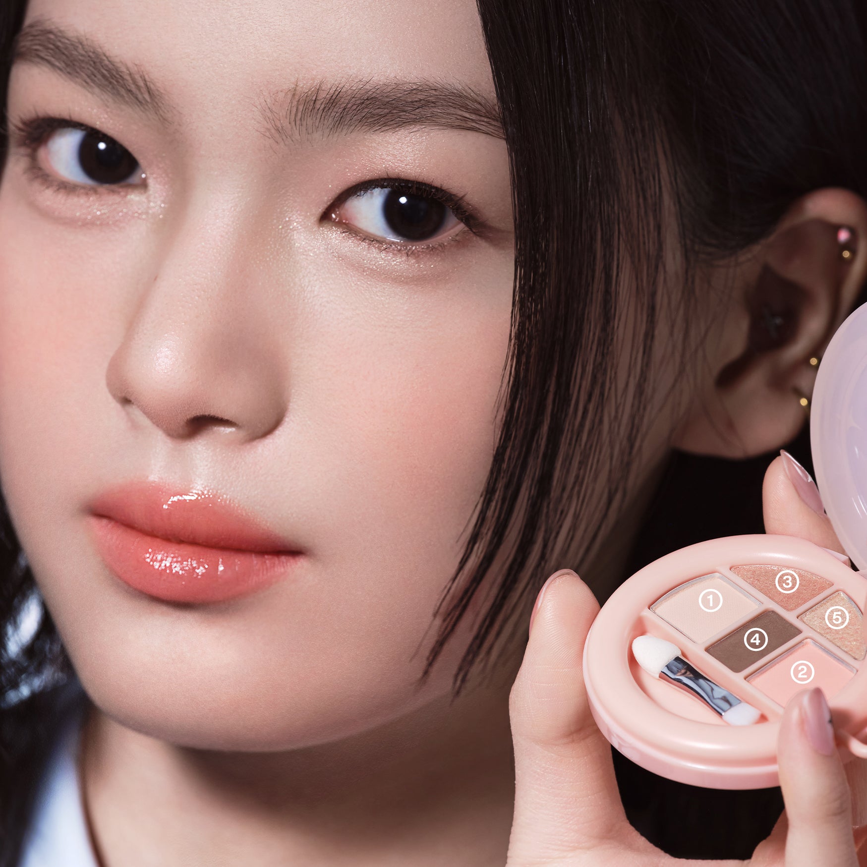 - Highlight – Tap on shimmer ③ or glitter ⑤ to spotlight the center of your aegyo-sal, inner corners, or cupid’s bow
